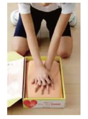 ① 箱のふたに描かれた顔の絵が、訓練者の右側または左側に来るように箱を置きます。箱の横にひざまずき、中央のスポンジ部分に重ねた手の付け根を置きます。力の弱いお子様や女性は、足を前後に少しずらすと力が入りやすくなります。